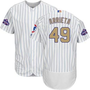Authentic MLB Cubs #49 Jake Arrieta White(Blue Strip) Gold Program Cool Base Stitched MLB Jersey