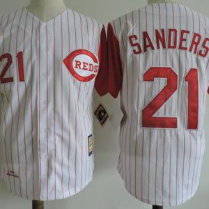 Authentic MLB Mitchell And Ness 1997 Reds #21 Reggie Sanders White Strip Throwback Stitched MLB Jersey