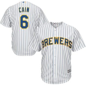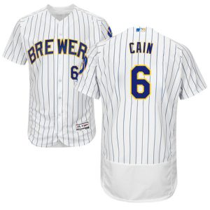 Authentic MLB Brewers #6 Lorenzo Cain White Strip Flexbase Authentic Collection Stitched MLB Jersey