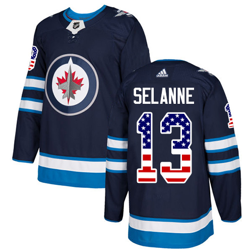 NHL Hockey Adidas Jets #13 Teemu Selanne Navy Blue Home Authentic USA Flag Stitched NHL Jersey